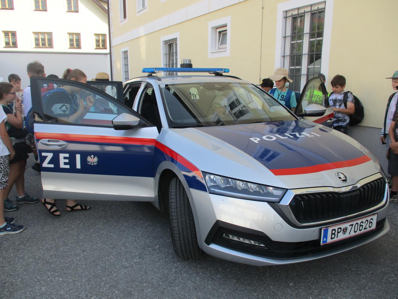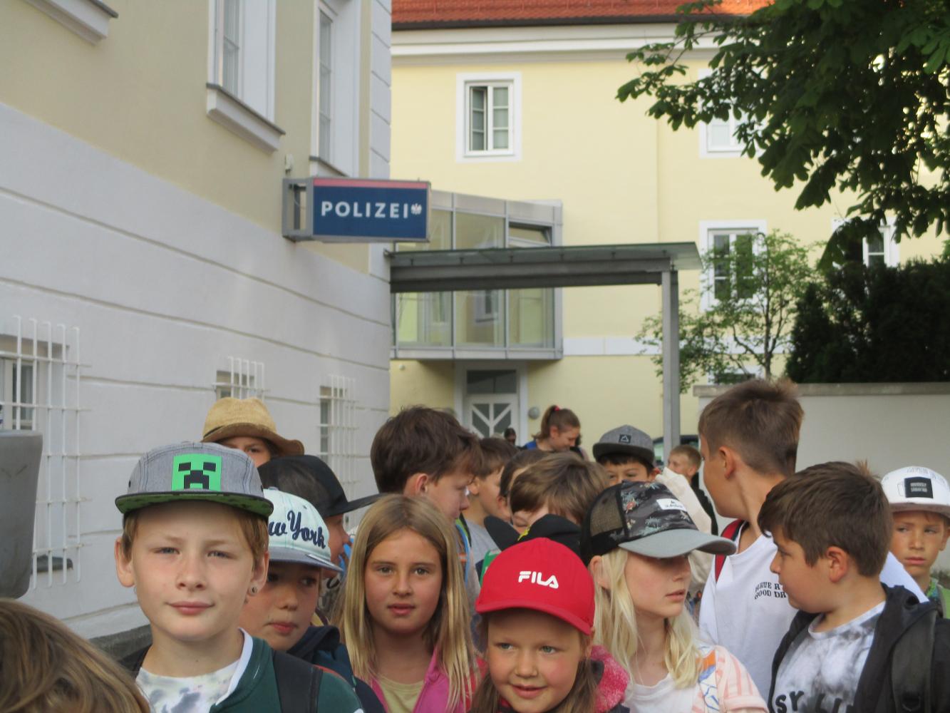 Heute besuchte die 3. und 4. Klasse die Polizei. Zuerst besichtigten die Kinder die Räumlichkeiten, wobei die Gefängniszelle natürlich der Höhepunkt war. Anschließend ging es in den Hof zu einem Polizeiauto. Dort durften sie Probesitzen, Handschellen anziehen und der Inhalt des Kofferraums wurde genau inspiziert. Das Lasermessgerät und der Alkomat wurden zum Beispiel gezeigt. Natürlich wurde auch kurz das Blaulicht und die Sirene eingeschaltet. Bevor die Kinder zurück zur Schule gingen, aßen sie noch gemeinsam ein Eis vom Valier!