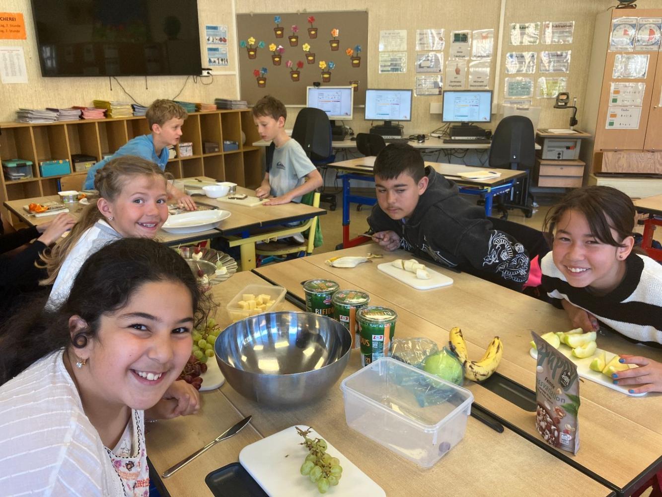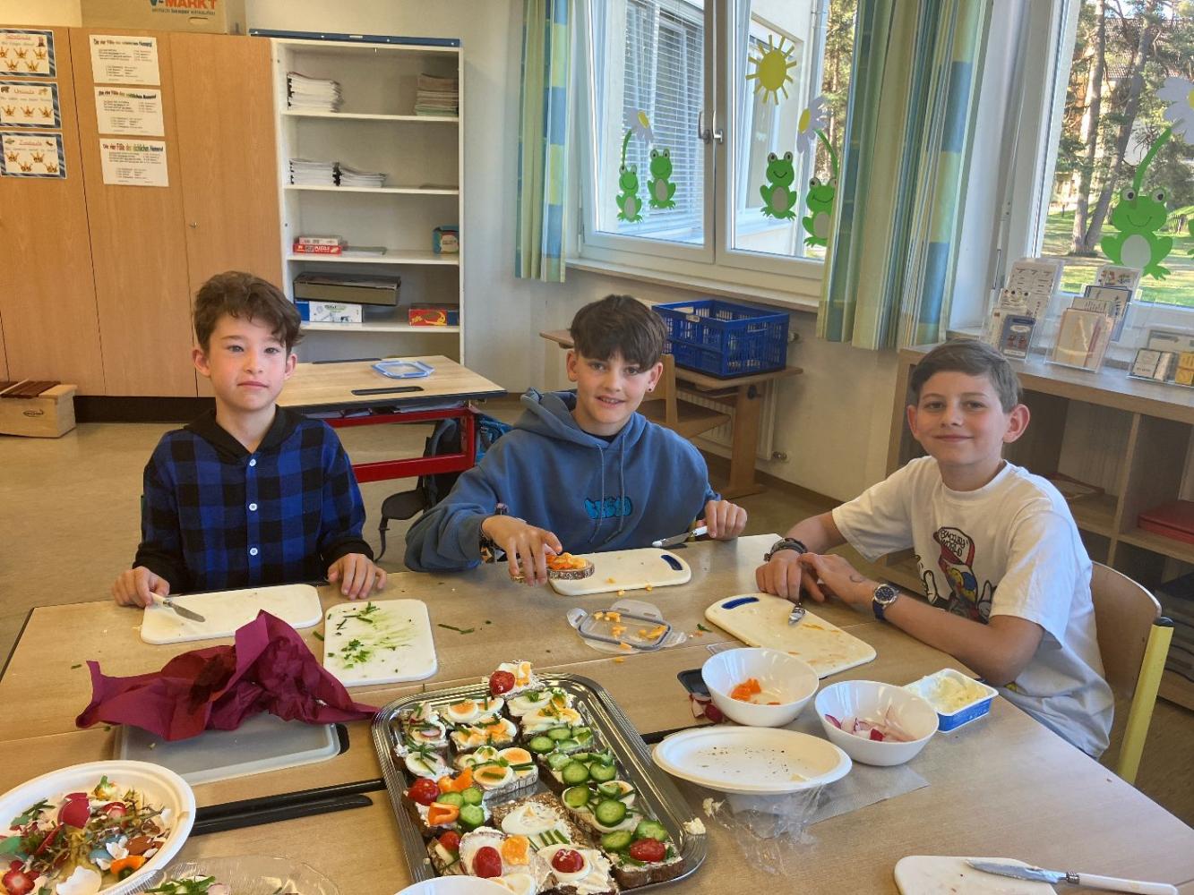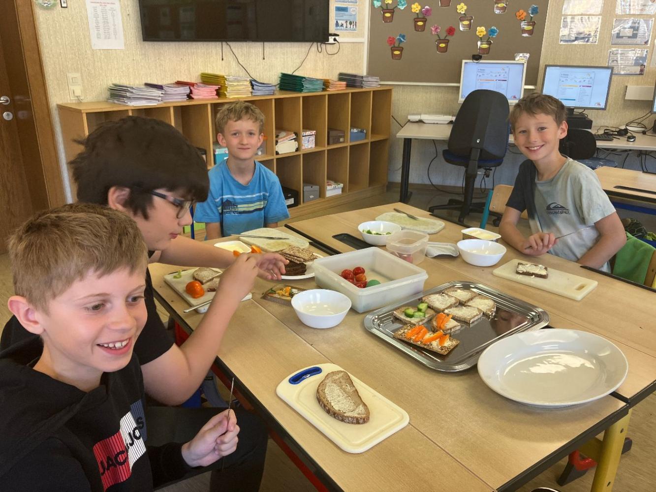 Nachdem wir uns in dieser Woche intensiv mit der Bedeutung und Wichtigkeit einer gesunden Lebensweise beschäftigten, setzten wir die Theorie auch in die Tat um und bereiteten eine gesunde Jause mit allerlei leckeren Lebensmitteln zu. Dabei wurde fleißig Gemüse geschnitten und damit verschiedene Vollkornbrote belegt, Joghurt mit einem Obstsalat und Nüssen vermischt und Käse-Trauben-Sticks hergestellt.