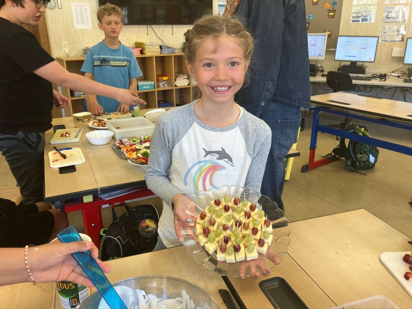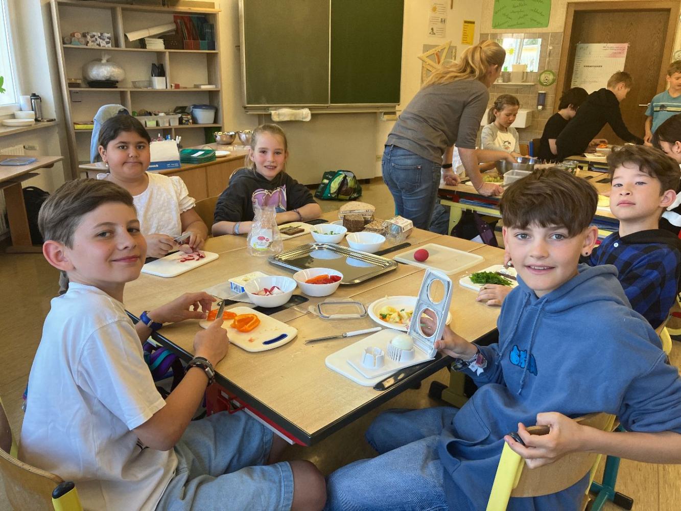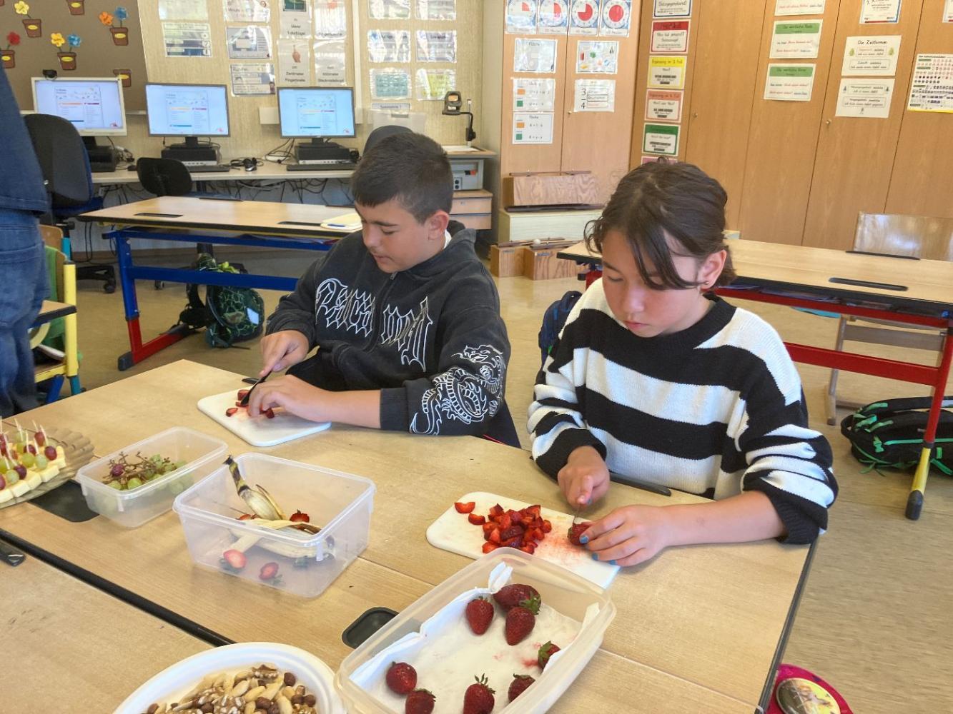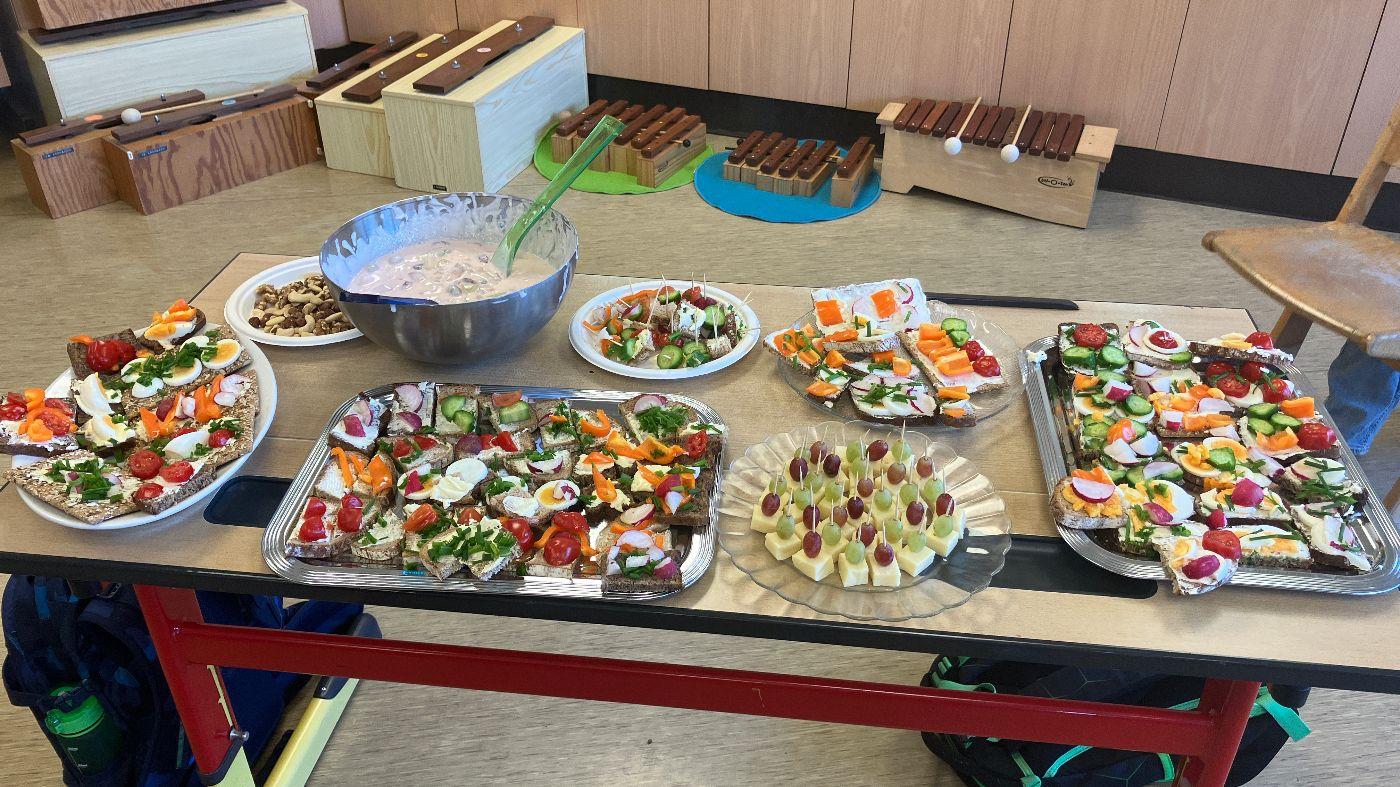 Nachdem wir uns in dieser Woche intensiv mit der Bedeutung und Wichtigkeit einer gesunden Lebensweise beschäftigten, setzten wir die Theorie auch in die Tat um und bereiteten eine gesunde Jause mit allerlei leckeren Lebensmitteln zu. Dabei wurde fleißig Gemüse geschnitten und damit verschiedene Vollkornbrote belegt, Joghurt mit einem Obstsalat und Nüssen vermischt und Käse-Trauben-Sticks hergestellt.