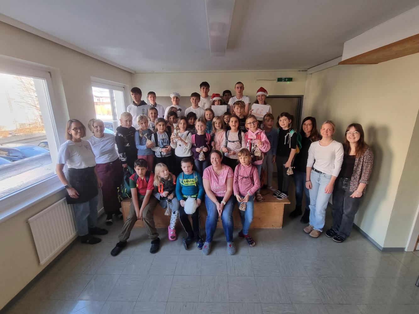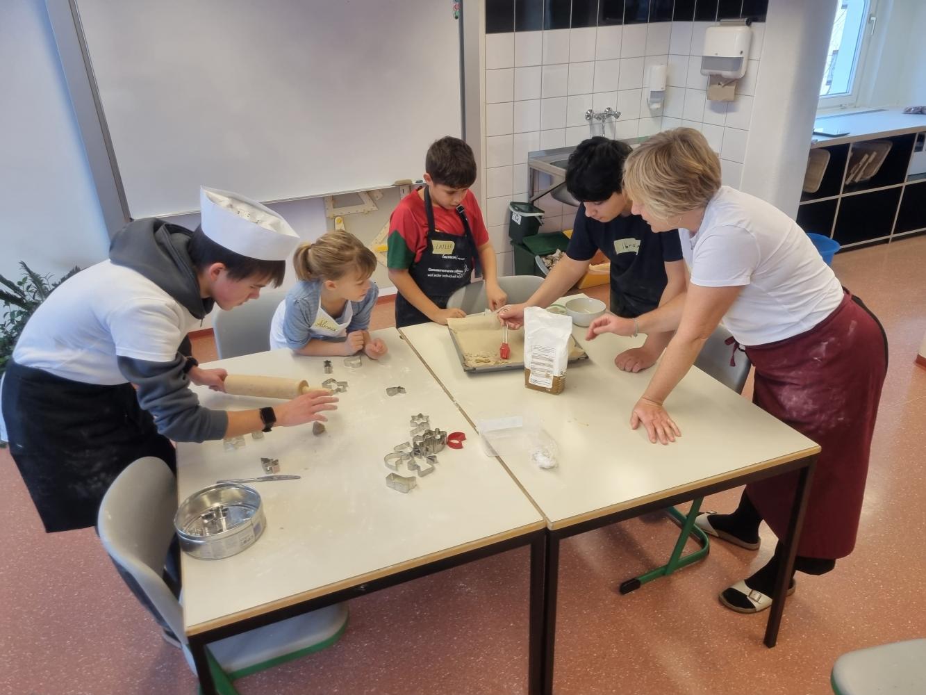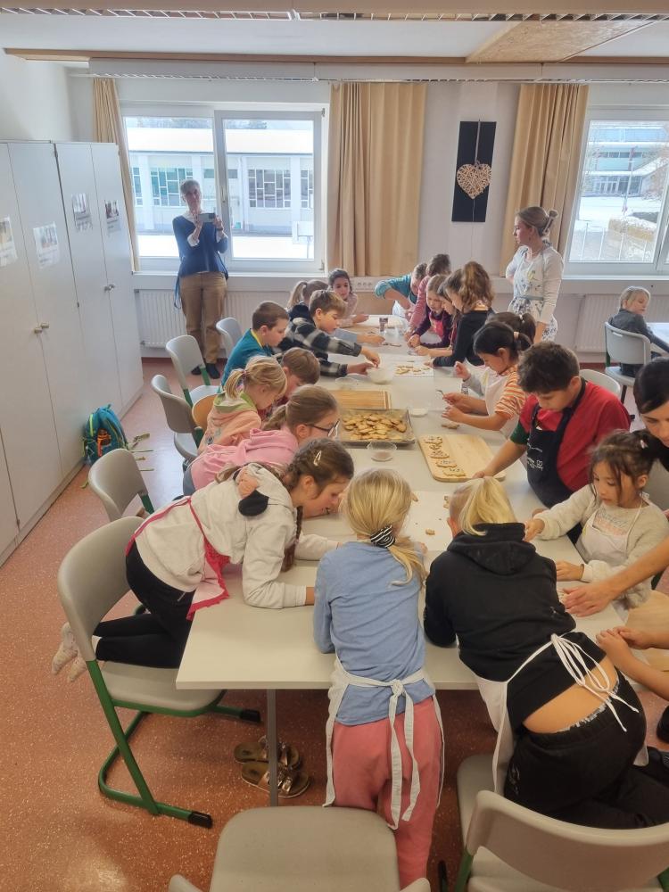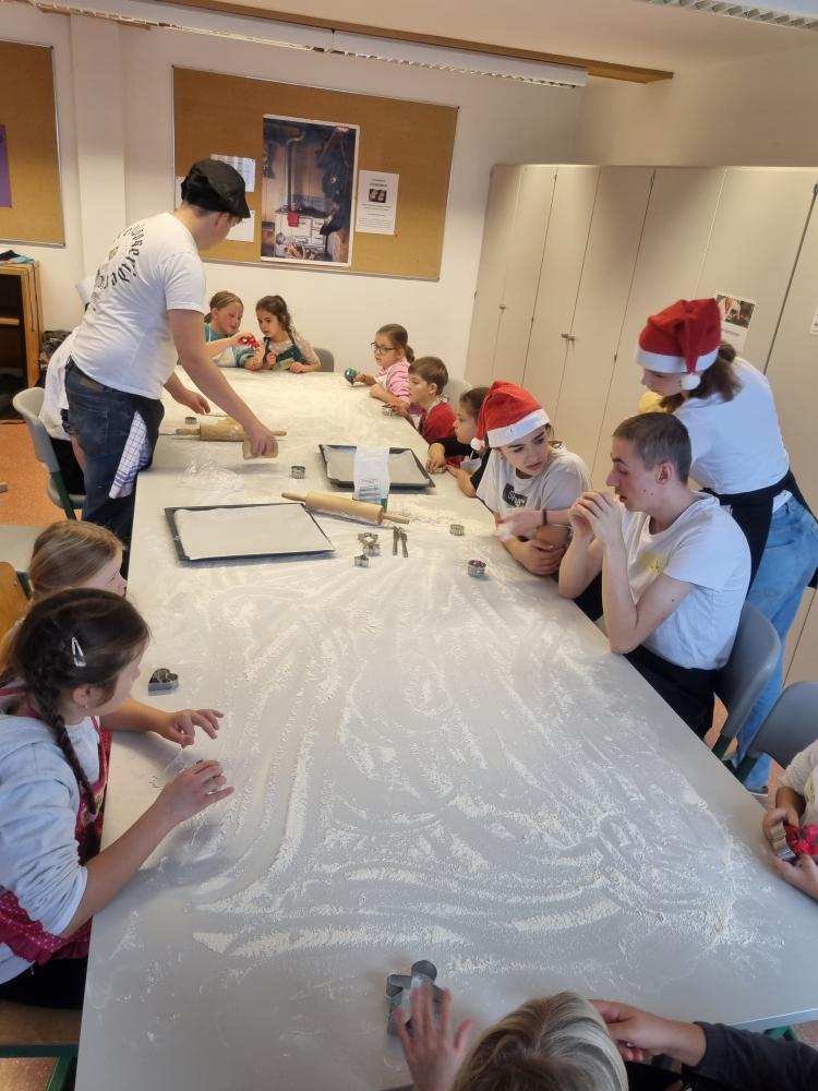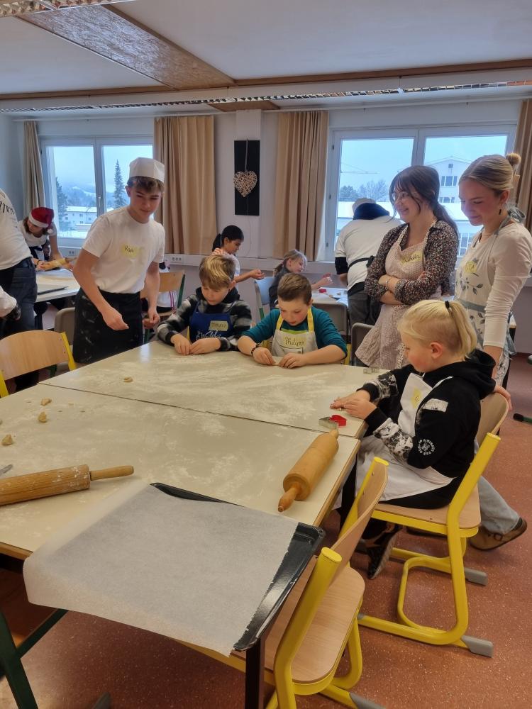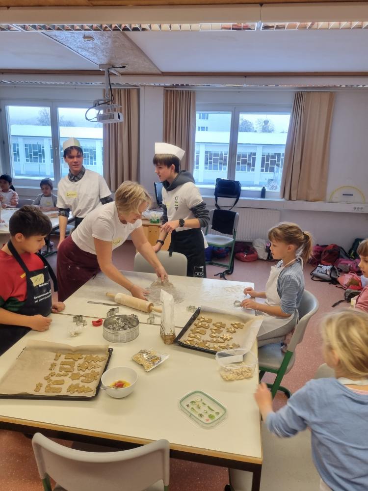 Am 10.12.24 machte sich die 2. Klasse auf den Weg in die Polytechnische Schule in Reutte. Dort warteten schon Frau Klotz und Frau Leuprecht mit den Jugendlichen des FB Tourismus. Wir durften mit ihnen Kekse backen. Nachdem wir unsere Schürzen angezogen hatten, konnte es auch schon losgehen. In der Weihnachtsbäckerei wurden Vanillekipferl, Ausstechkekse und Lebkuchen gefertigt und zum Schluss verziert. Jedes Kind durfte ein Säckchen mit den leckeren Keksen nach Hause nehmen. Auch Frodo Frostig, unser Advent-Maskottchen, durfte mit und stibitzte das ein oder andere Keks.