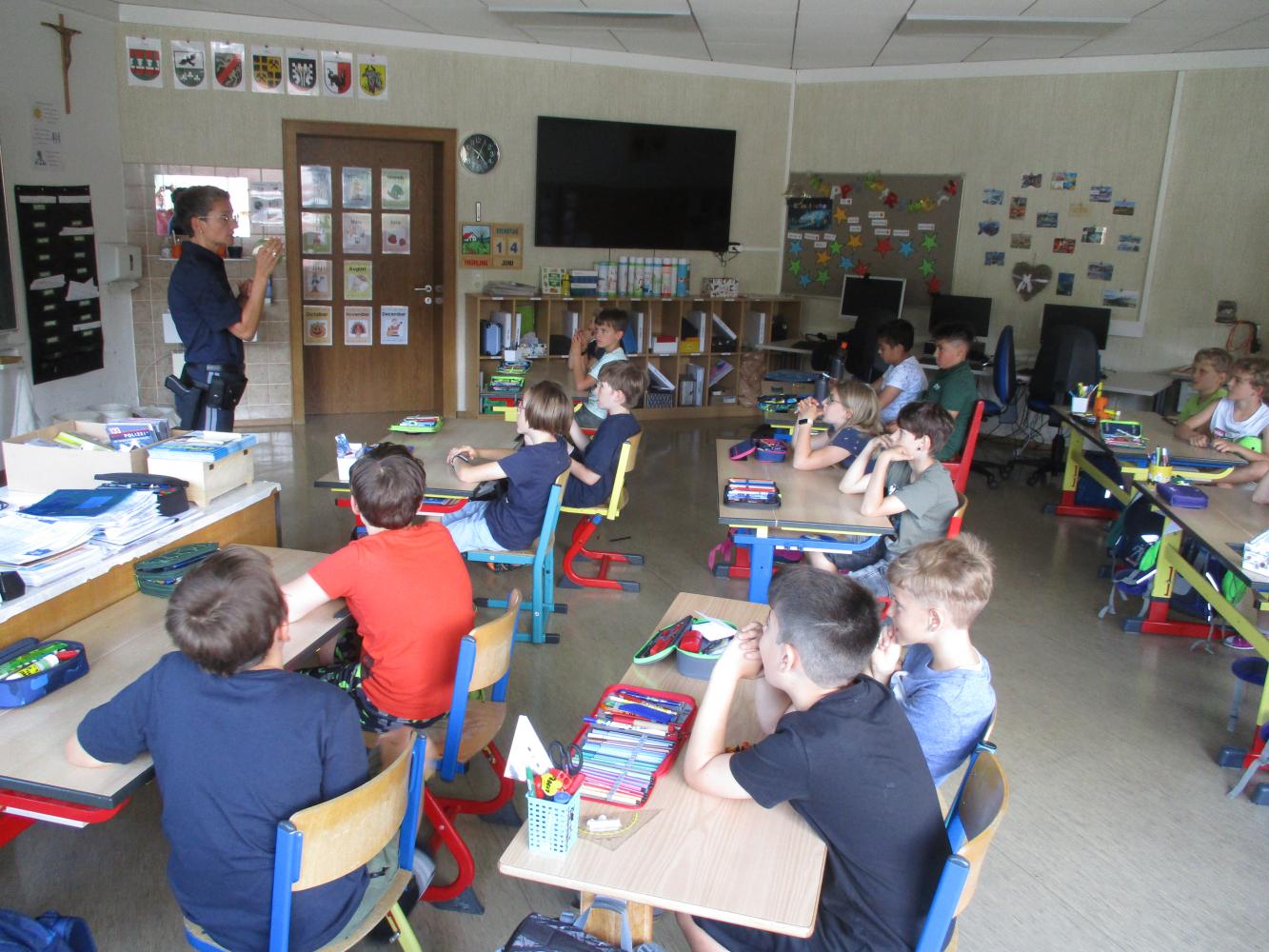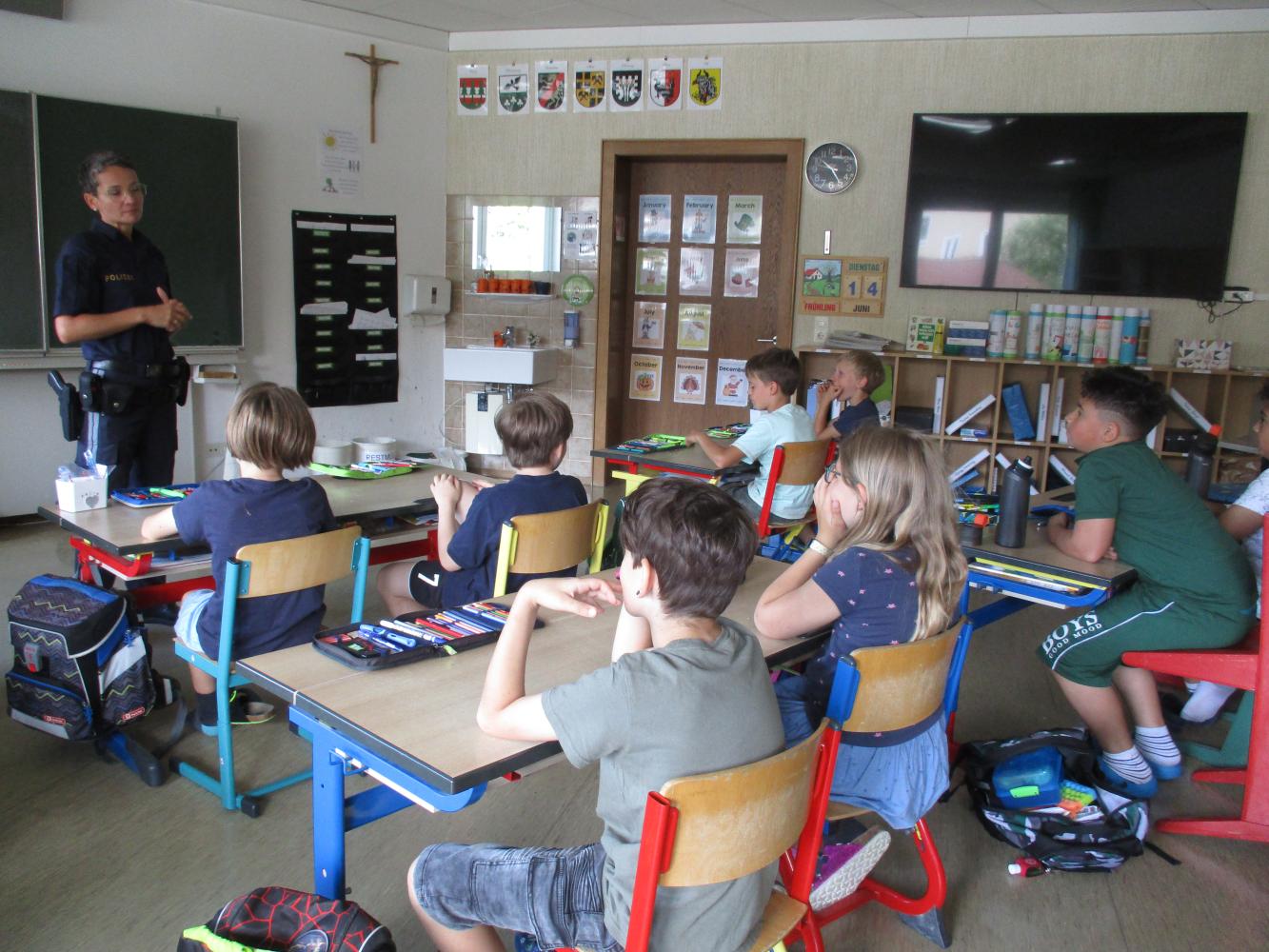 Heute (15.06.2022) besuchte Ruth von der Polizei Reutte nach der Pause die 3. Klasse. Sie brachte mit ihrer angenehmen Art den Kindern die Arbeit der Polizei, sowie das Verhalten in verschiedenen Situationen näher und übernahm die Kinder dann in den Status der Kinderpolizei.