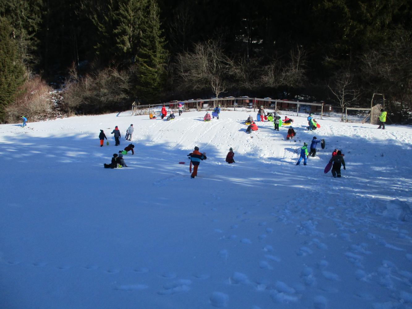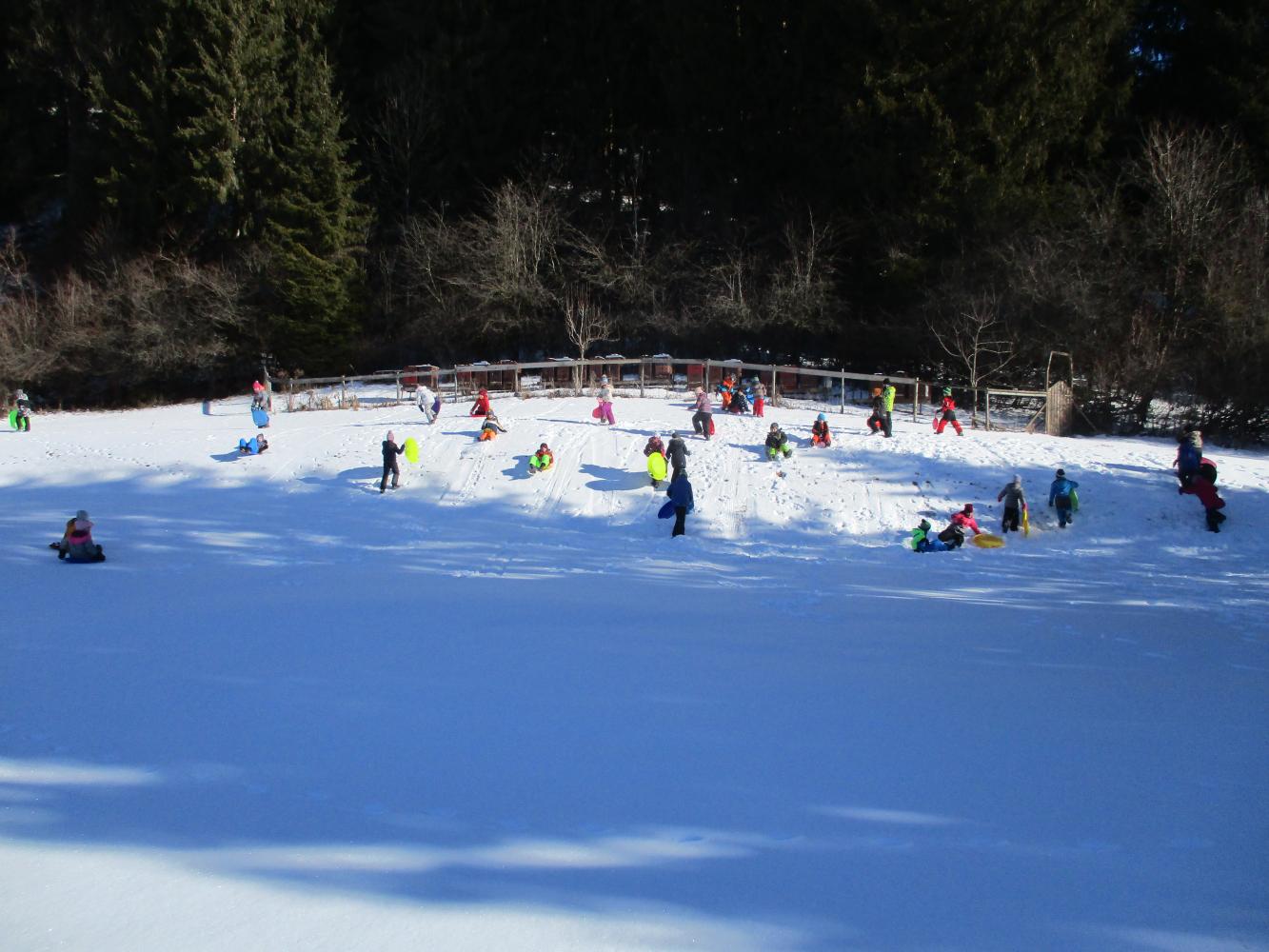 Bei herrlichem Winterwetter nutzten die 1. und 2. Klasse den Neuschnee aus und gingen zum Steineberg "Tellerrutschen". (Mittwoch, 09.02.2022)