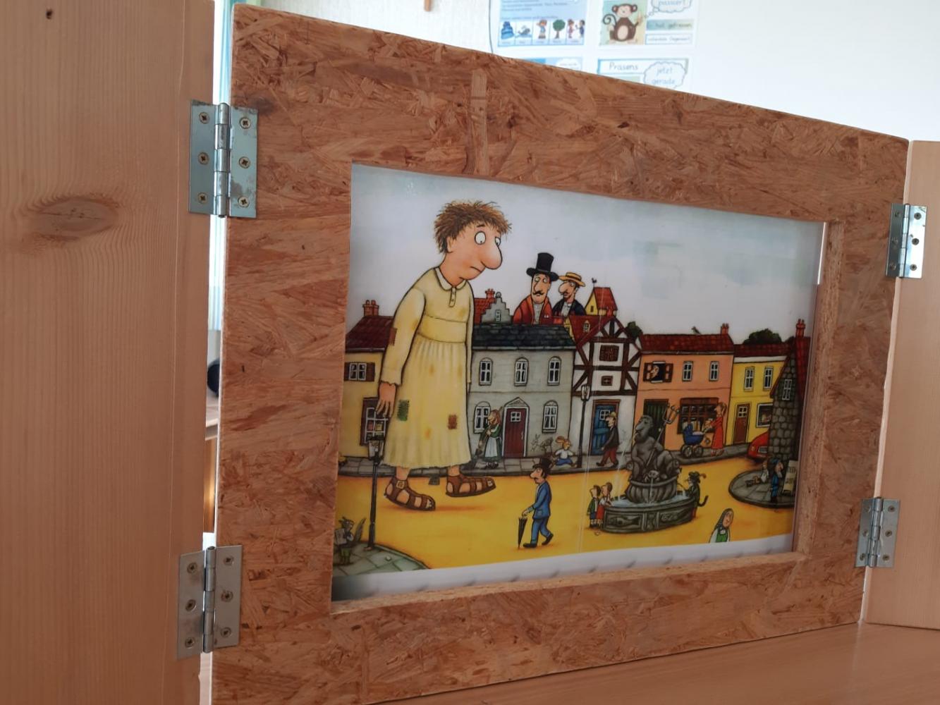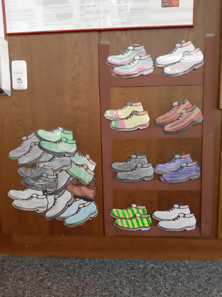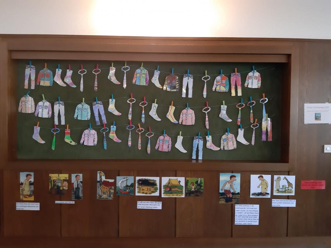 Alle Kinder bastelten dann im Anschluss Kleidungsstücke für den Riesen. Schuhe, Krawatten, Socken, Hosen und Hemden wurden gemalt und am Ende als "Schauwand" aufgehängt.