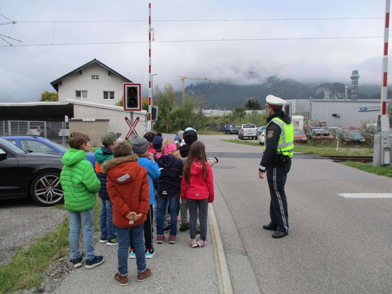 Ebenso erklärte und zeigte Polizist Simon den Kindern, wie man sich richtig bei einem Bahnübergang verhält!